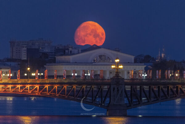Луна снята на телескоп с расстояния 19 километров от «Лахта Центра» из деревни Энколово, на закате, около 3:30 30 августа 2023 года.